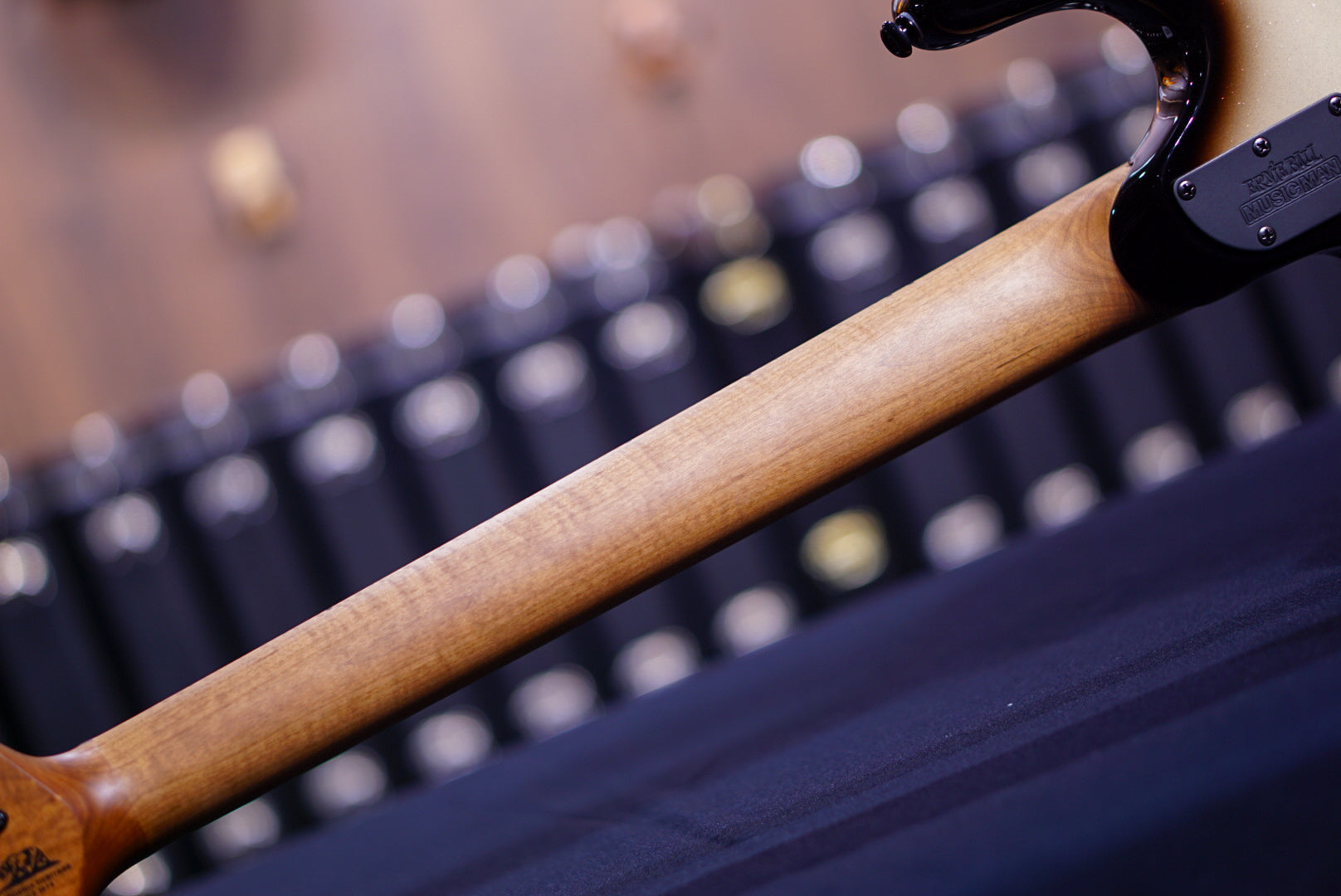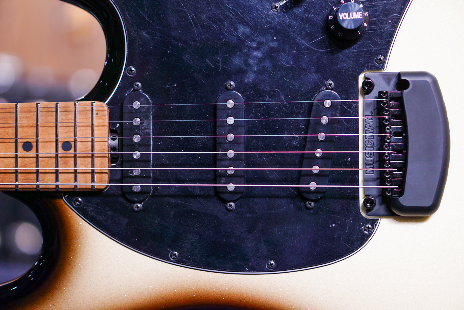 | Bridge | Music Man® Modern tremolo with crescent cover and vintage bent steel saddles |
