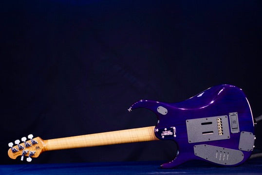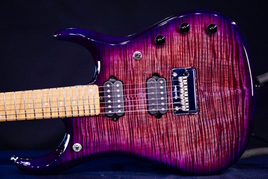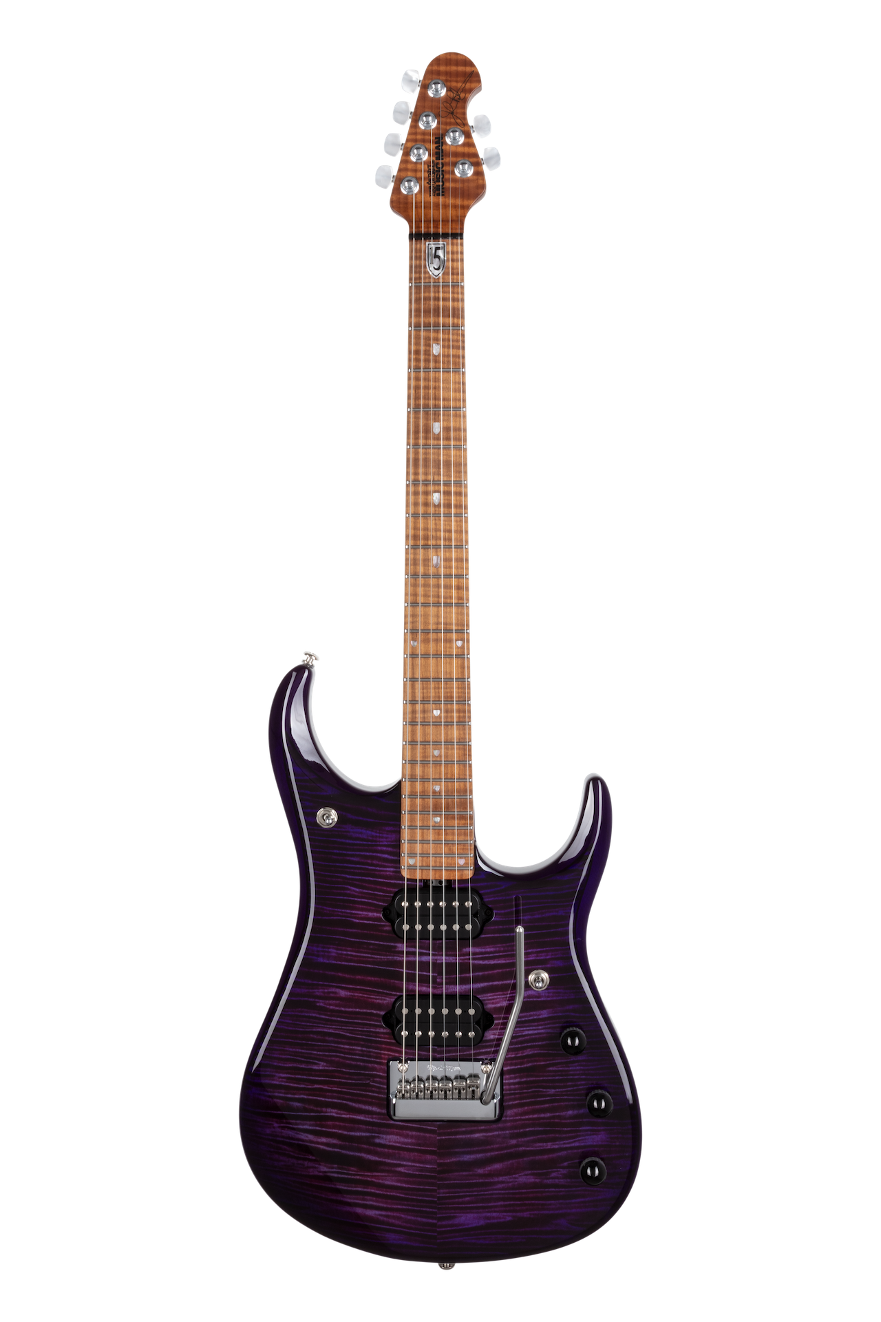 The JP15 features a lightweight Okoume body with a figured maple top. Available in Sahara Burst (with roasted maple top), Trans Black Burst, Cerulean Paradise and two new colors, Tiger Eye (with roasted maple top) and Purple Nebula. Each beautiful finish complements the flame or quilt figuring with stunning effect. Roasted maple neck and fingerboard adds just the right amount of snap and brightness while providing more stability in ever-changing climates. The JP 15 is powered by twin custom DiMarzio Illuminator pickups, piezo bridge system and onboard 20db gain boost. Available in 6 or 7 string with Music Man JP tremolo, 3-way Toggle pickup selector and Music Man hardshell case.