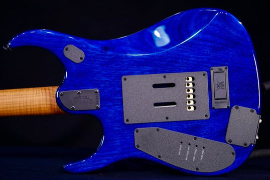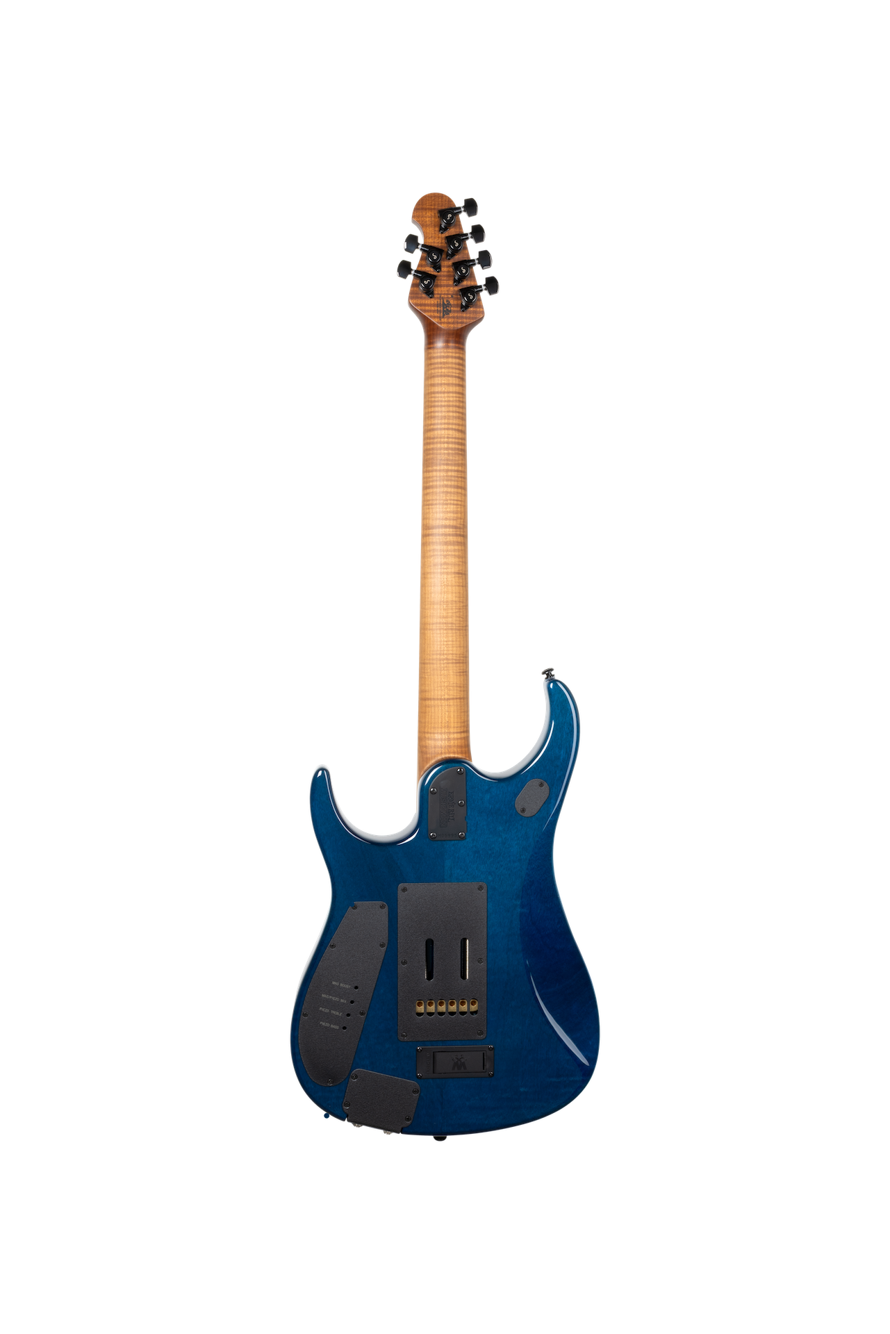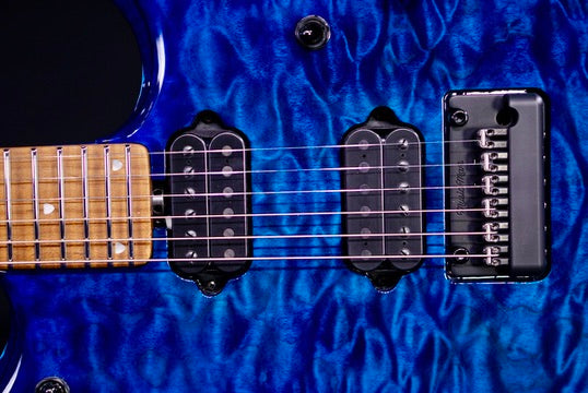The JP15 features a lightweight okoume body with your choice of a quilted or flame maple top, offered in striking Red Tide, Green Tiger Eye, Ultramarine, and Amber Waves finishes. Its roasted figured maple neck and fingerboard deliver a smooth, fast-playing surface enhanced by stainless steel frets and a hand-rubbed oil and wax finish for natural comfort. Electronics include DiMarzio Illuminator pickups, a piezo-equipped bridge for realistic acoustic tones, and an onboard 20+dB gain boost for added punch and tonal range. The piezo system supports mono or stereo output, letting you route magnetic and piezo signals through separate chains. Two 3-way toggle switches give you full control—one selects between magnetic, piezo, or combined output, while the other toggles between bridge, neck, or both magnetic pickups. A push/push tone knob splits the coils in the middle position for added versatility. Additional features include a floating Music Man JP tremolo, locking Schaller tuners, and a Mono case, with 6- and 7-string configurations available.
