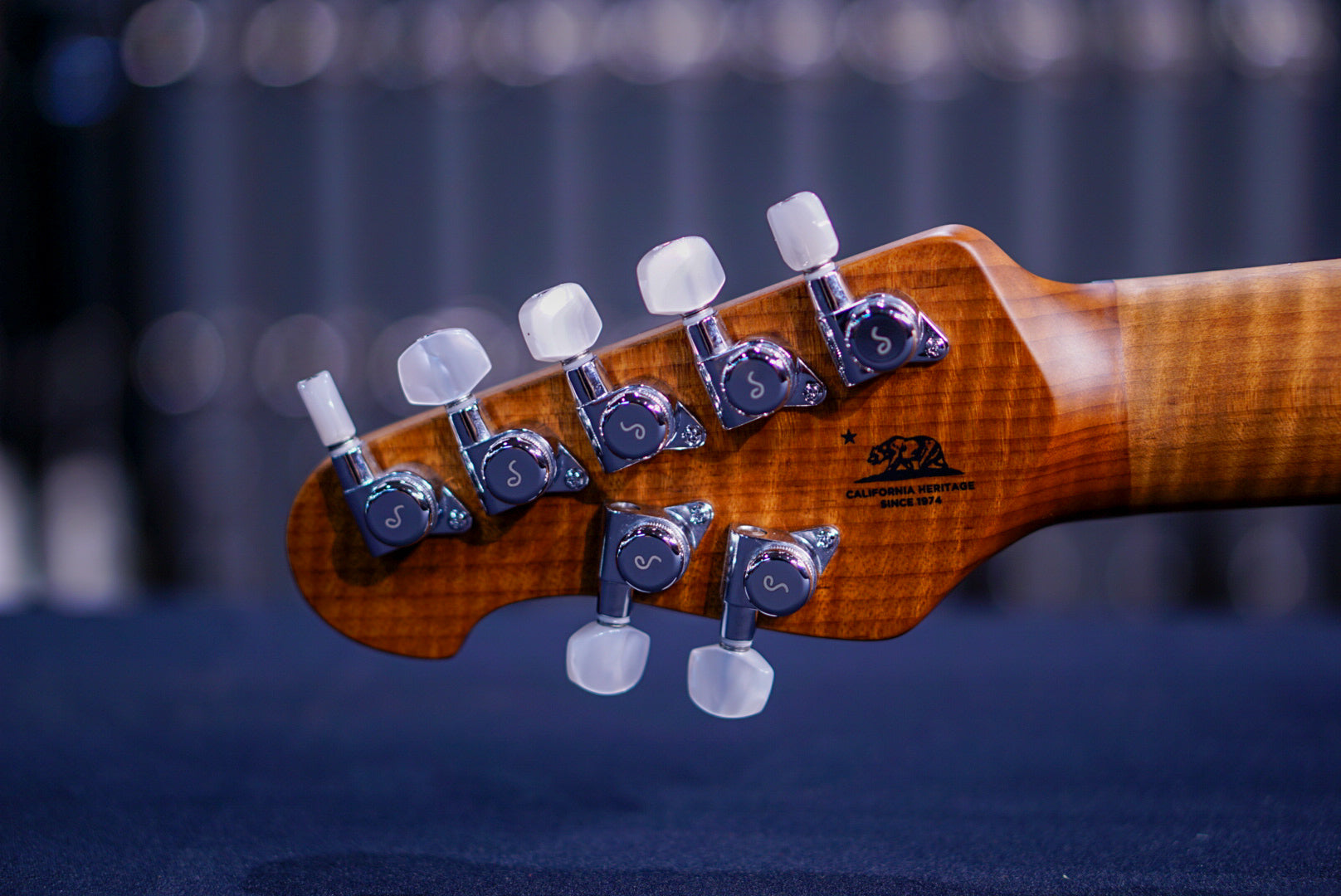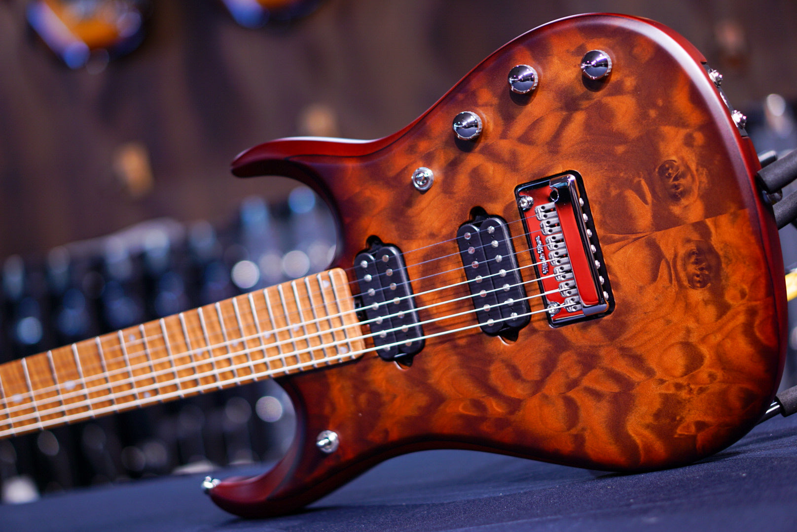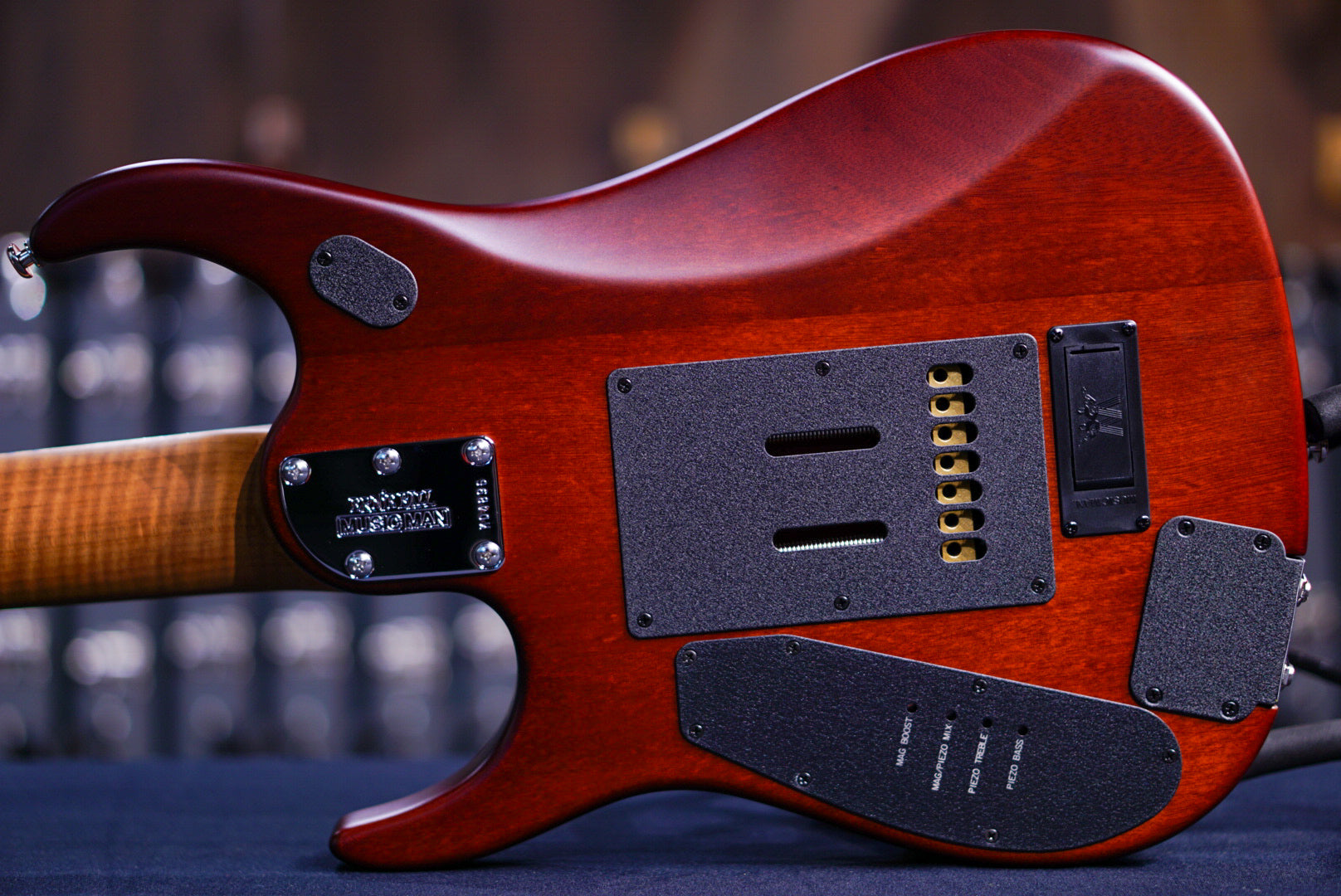 The JP15 features a lightweight Okoume body with a figured maple top. Available in Sahara Burst (with roasted maple top), Trans Black Burst, Cerulean Paradise and two new colors, Tiger Eye (with roasted maple top) and Purple Nebula. Each beautiful finish complements the flame or quilt figuring with stunning effect. Roasted maple neck and fingerboard adds just the right amount of snap and brightness while providing more stability in ever-changing climates. The JP 15 is powered by twin custom DiMarzio Illuminator pickups, piezo bridge system and onboard 20db gain boost. Available in 6 or 7 string with Music Man JP tremolo, 3-way Toggle pickup selector and Music Man hardshell case.
