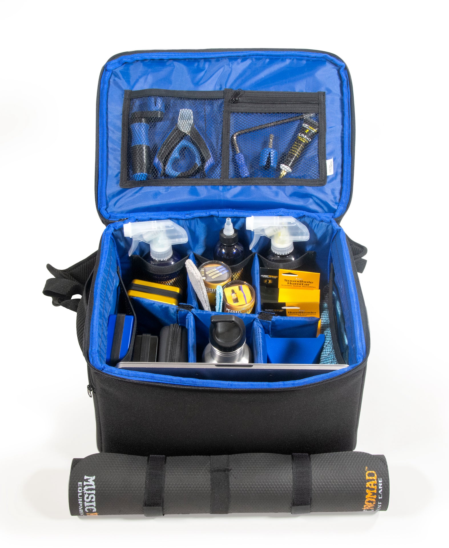 Finally, a gear bag with backpack straps designed and built with the guitar player in mind! MusicNomad’s GOMAD Guitarist Gear Bag has all the backstage and onstage organization needed to play and maintain your equipment. The two large and sturdy stacked compartments not only store a ton, but it’s easy to find what you need quickly. The rugged, weather-resistant exterior features 1200D recycled polyester (rPET) made from recycled water bottles. No detail is overlooked, including 15 sidewall storage compartments all easy to see and access, plus straps to store your work mat, guitar stand and cables. Additional features include an impressive 36 liters of total storage, high quality external zippers, 1/2” padded construction on all sides to protect your gear, thick air mesh comfort shoulder and hand straps, and a moveable padded divider partition. Load it up and take it wherever you GO….the studio, home, shop, gig and rehearsal. That’s MusicNomad quality – raising the bar in the equipment care.