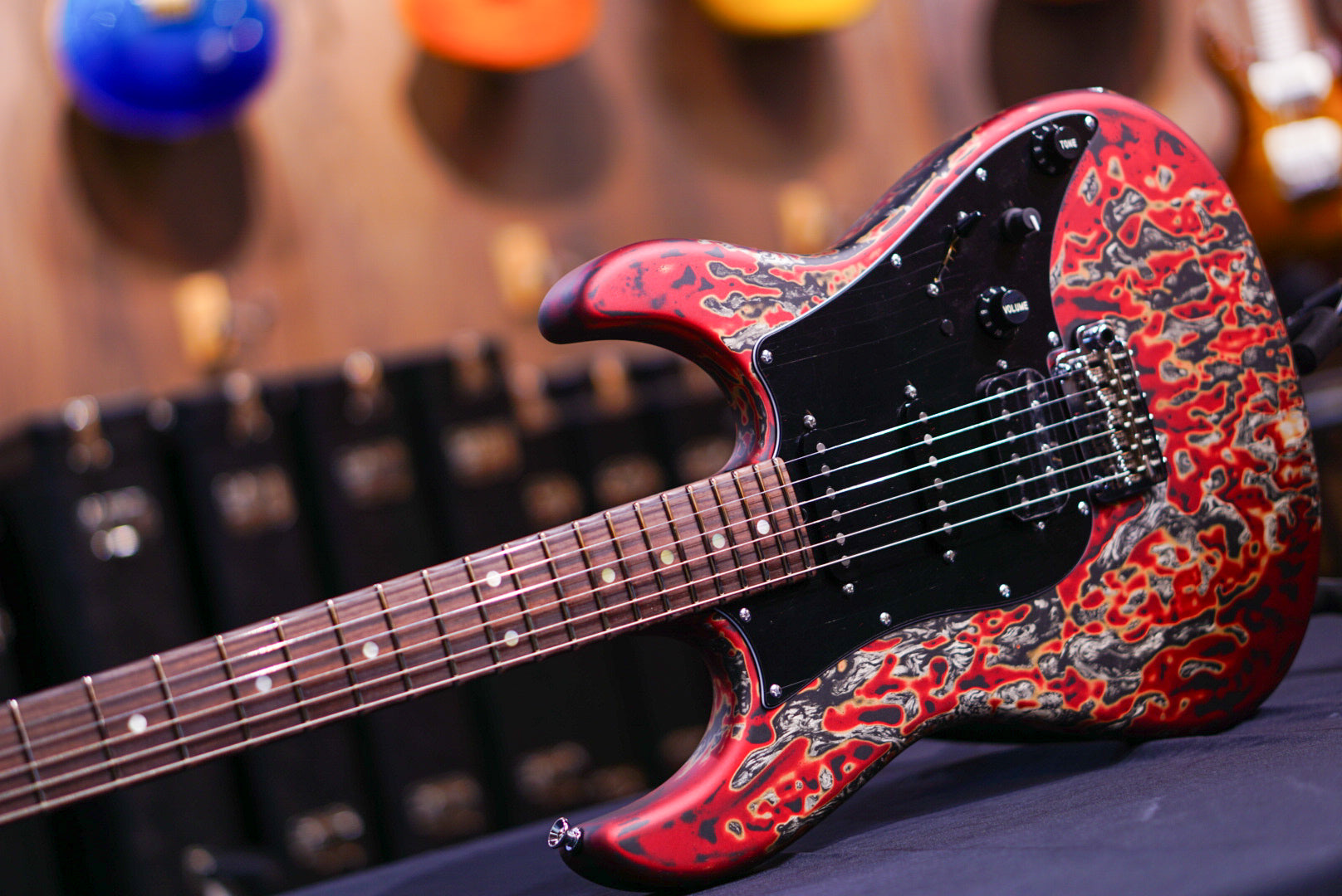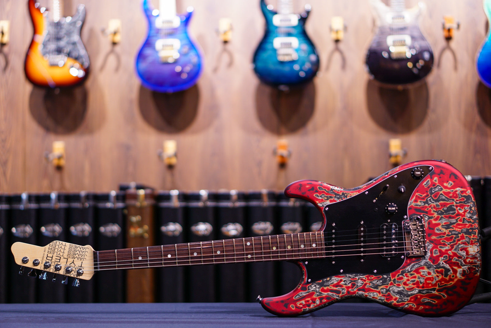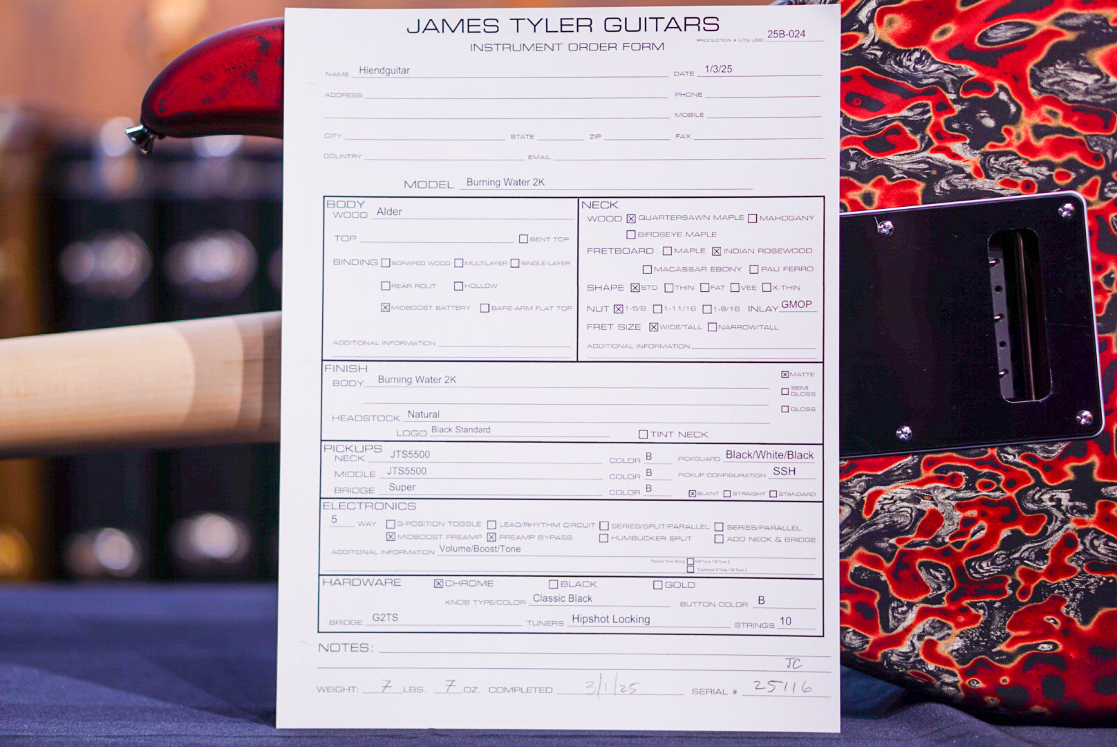 Studio Elite Burning Water 2K - Alder solid body, standard shaped Quartersawn Maple neck with rosewood fretboard, 1 5/8" nut, wide/tall frets, Hipshot locking tuners, 3-ply black pickguard with straight black JTS5500 single coils and Super humbucker, master volume - midboost preamp with bypass button - master tone, G2TS bridge, chrome hardware and black strat knobs, fully painted Burning Water 2K finish