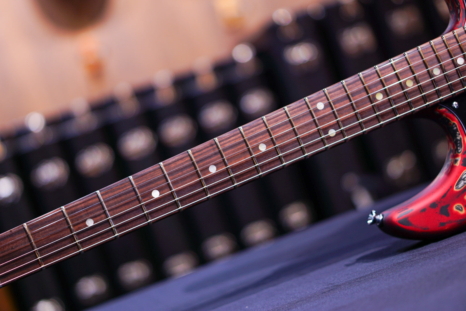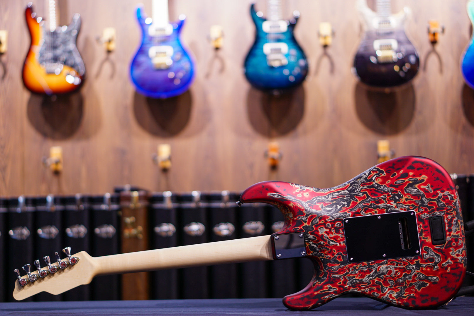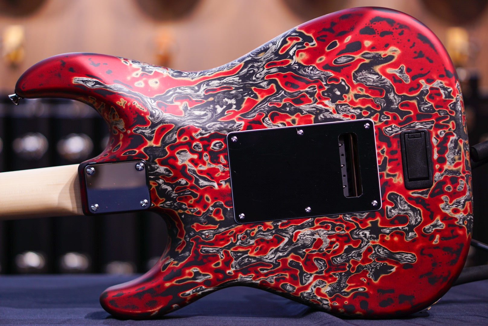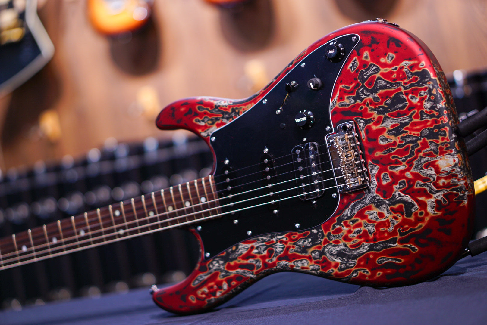 Studio Elite Burning Water 2K - Alder solid body, standard shaped Quartersawn Maple neck with rosewood fretboard, 1 5/8" nut, wide/tall frets, Hipshot locking tuners, 3-ply black pickguard with straight black JTS5500 single coils and Super humbucker, master volume - midboost preamp with bypass button - master tone, G2TS bridge, chrome hardware and black strat knobs, fully painted Burning Water 2K finish