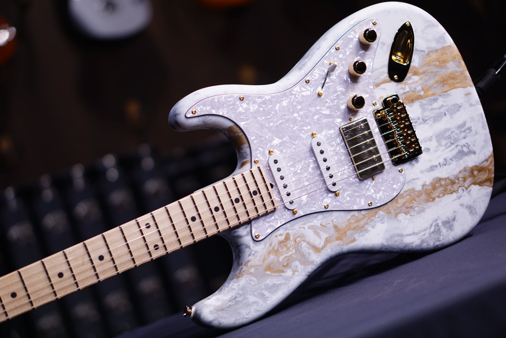 5/8" nut, narrow/tall frets, Hipshot Locking tuners, white pearl pickguard with JTS5500