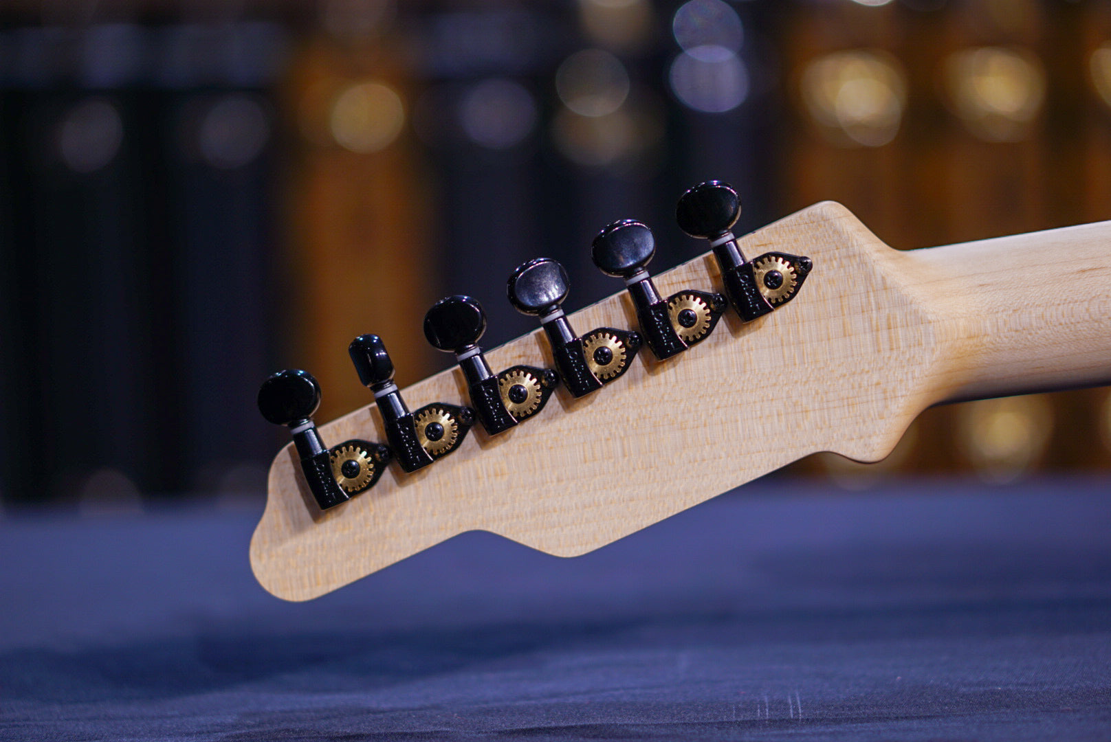 This super S has a solid Alder body, thin shape Quartersawn Maple neck with Indian Rosewood fingerboard, 1 5/8″ nut, wide/tall frets, Hipshot tuners, and a sleek Black/Yellow/Black pickguard. It’s loaded with Duncan Hot Stacks for neck/middle and Tyler Shark bridge humbucker, master volume – Midboost preamp with bypass button – master tone, series/parallel buttons for each pickup, Floyd Rose Classic bridge. If you can’t get every tone you need out of this guitar, you’re doing something wrong!