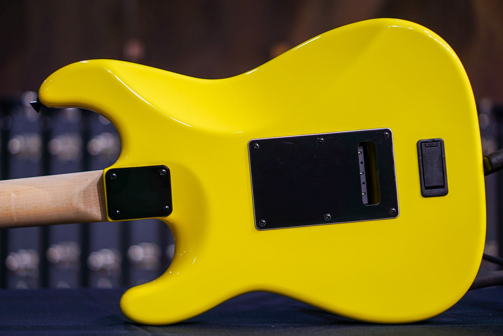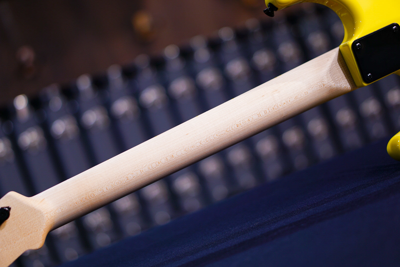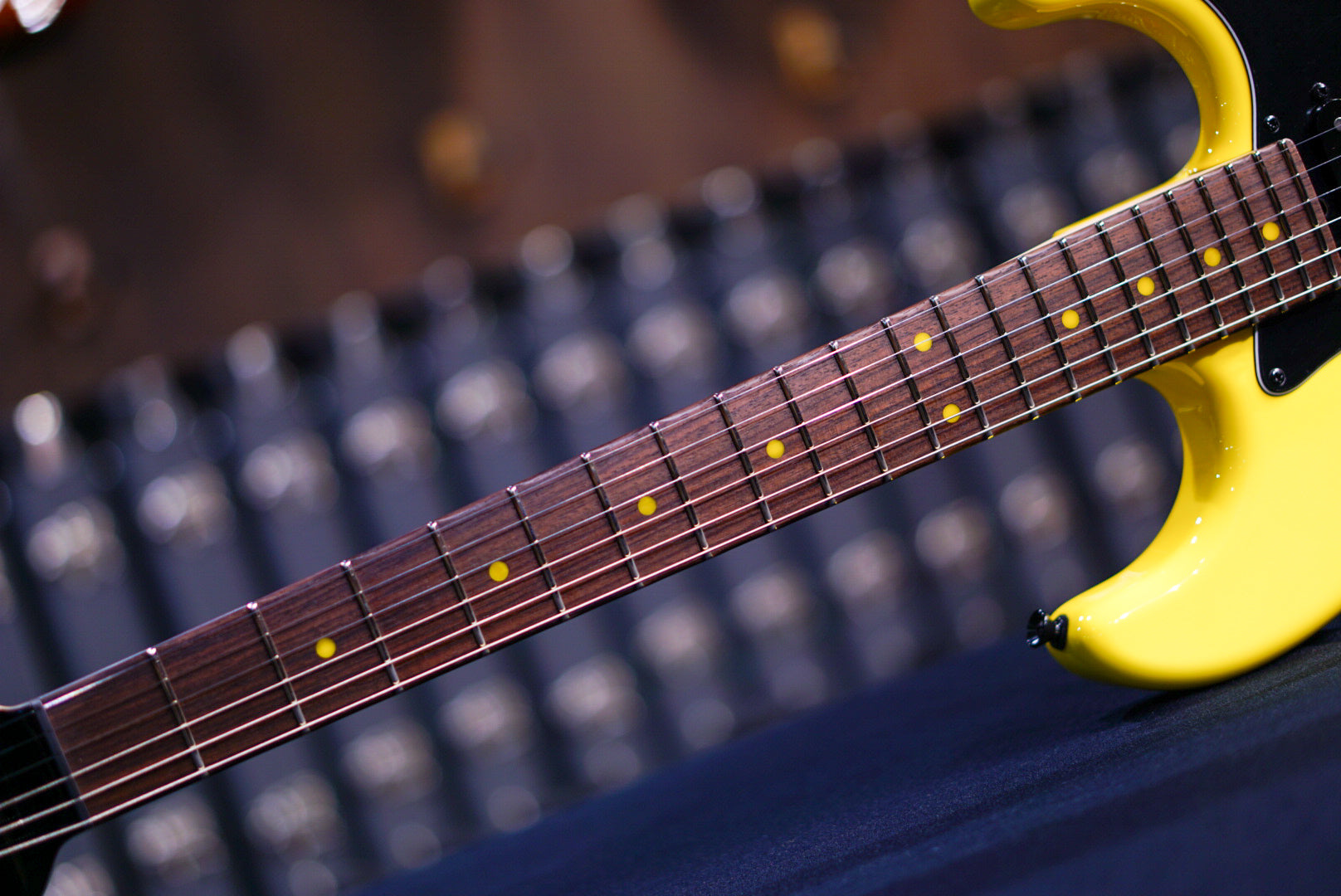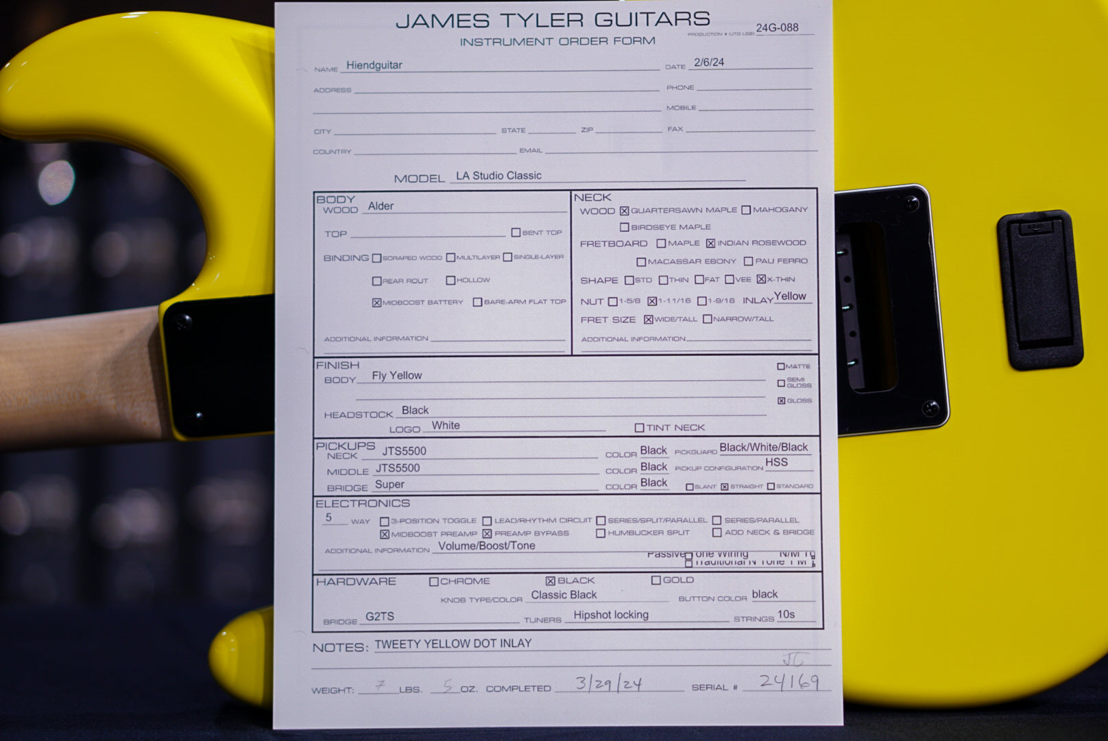 L.A. Studio Classic - Alder solid body, x-thin shape Quartersawn Maple neck and Rosewood fingerboard, 1 11/16" nut, wide/tall frets, Hipshot locking tuners, b/w/b pickguard with JTS5500 single coils and Super humbucker, master volume - midboost preamp with bypass button - master tone, G2TS bridge - Fly Yellow