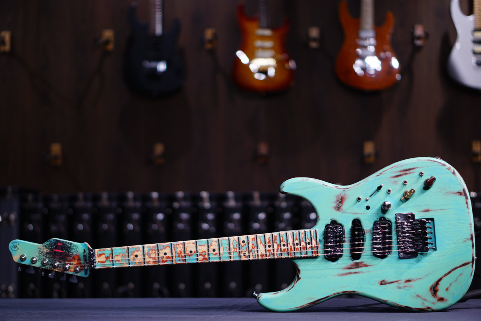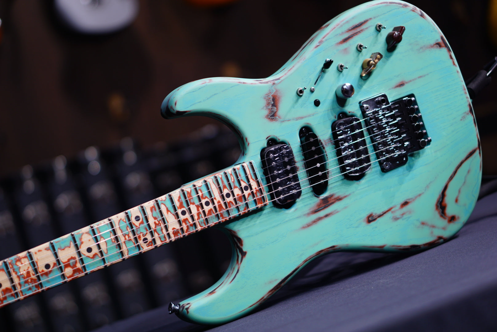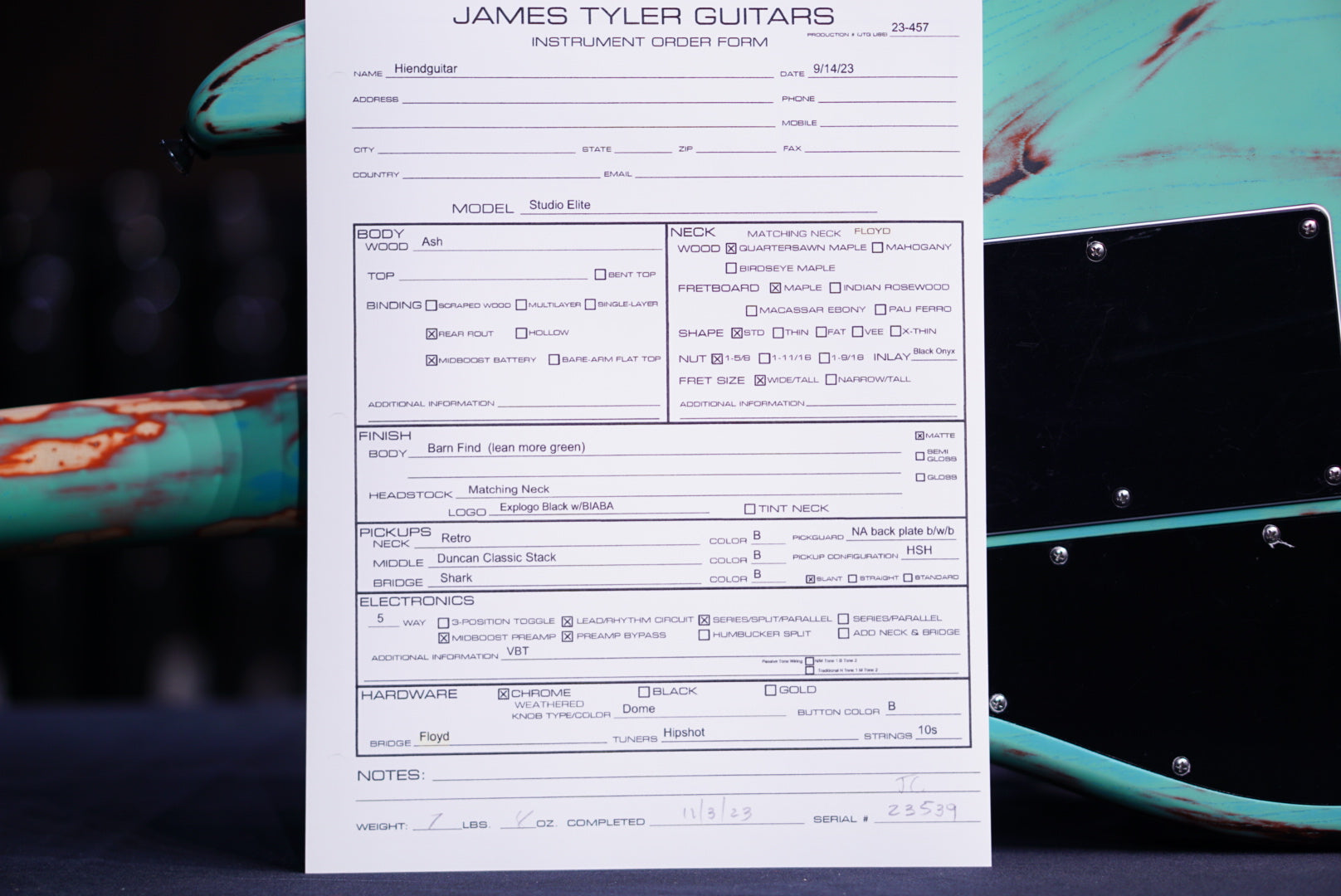 Studio Elite - standard shape Quartersawn Maple neck and fretboard, 1 5/8" nut, wide/tall frets, Hipshot tuners, rear rout with black slant Retro neck, Duncan Classic Stack and Shark bridge humbucker, master volume - lead/rhythm circuit - midboost preamp with bypass button, chrome hardware and dome knobs