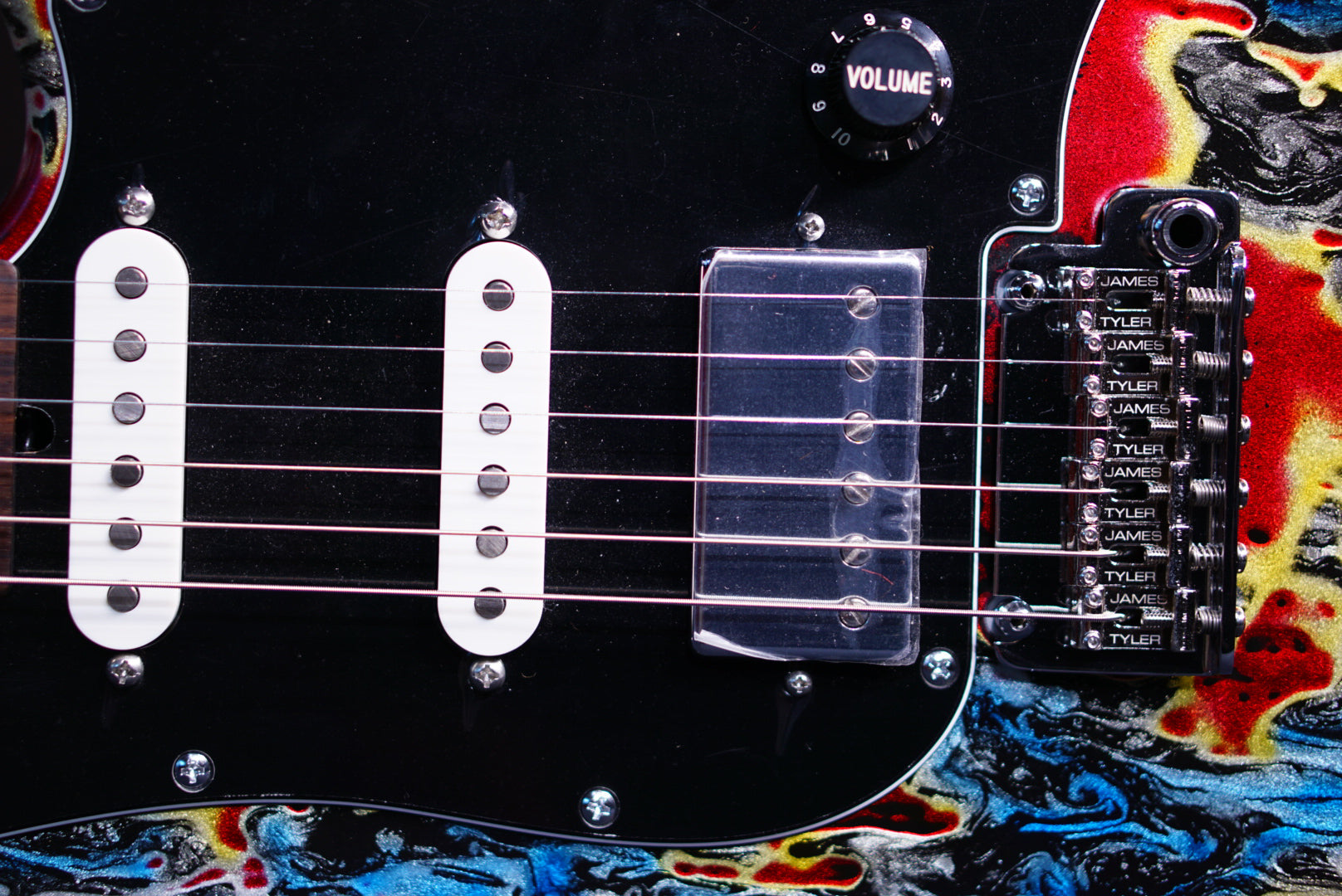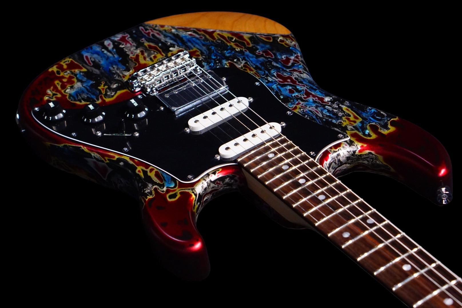 hardware and black strat knobs, Burning Water finish with bare-wood arm contour