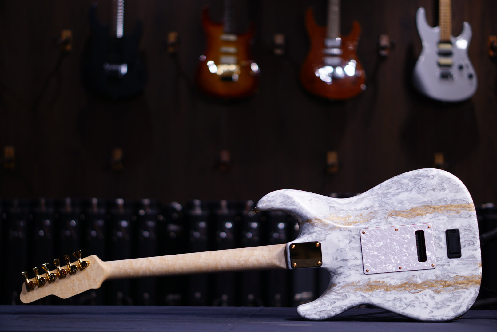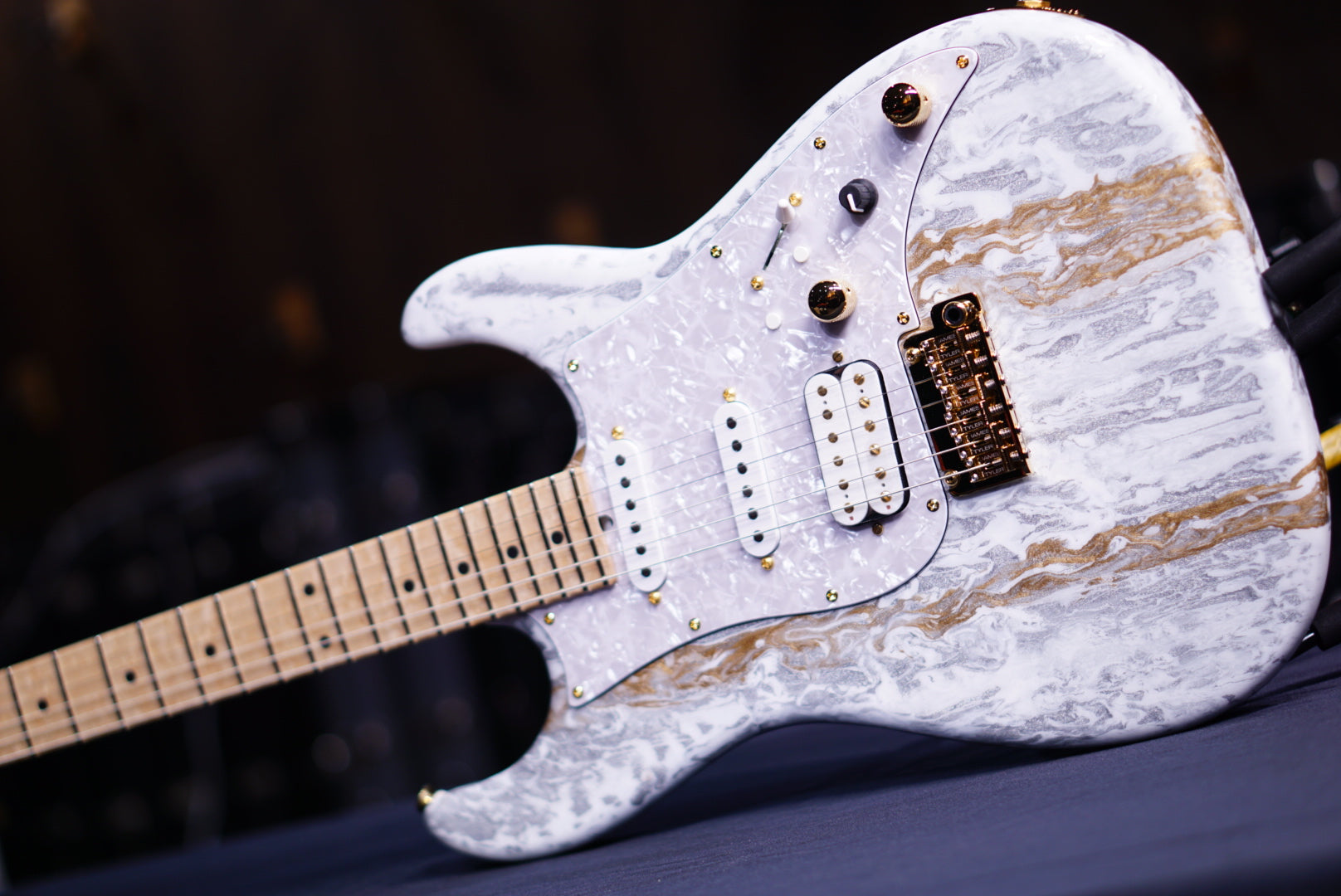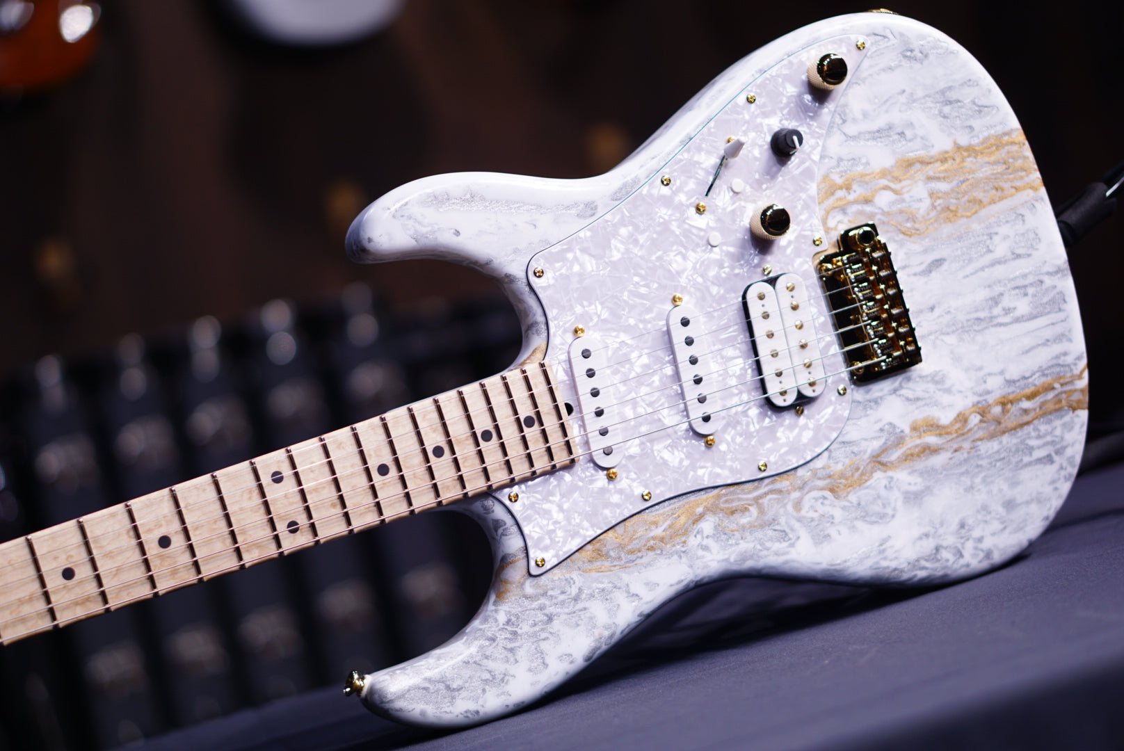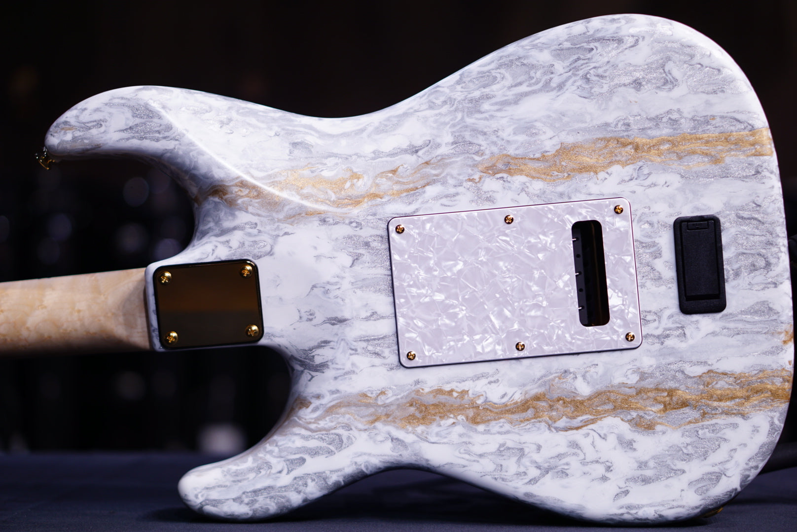 white pearloid pickguard with slant JTS5500 single coils and Super humbucker, master