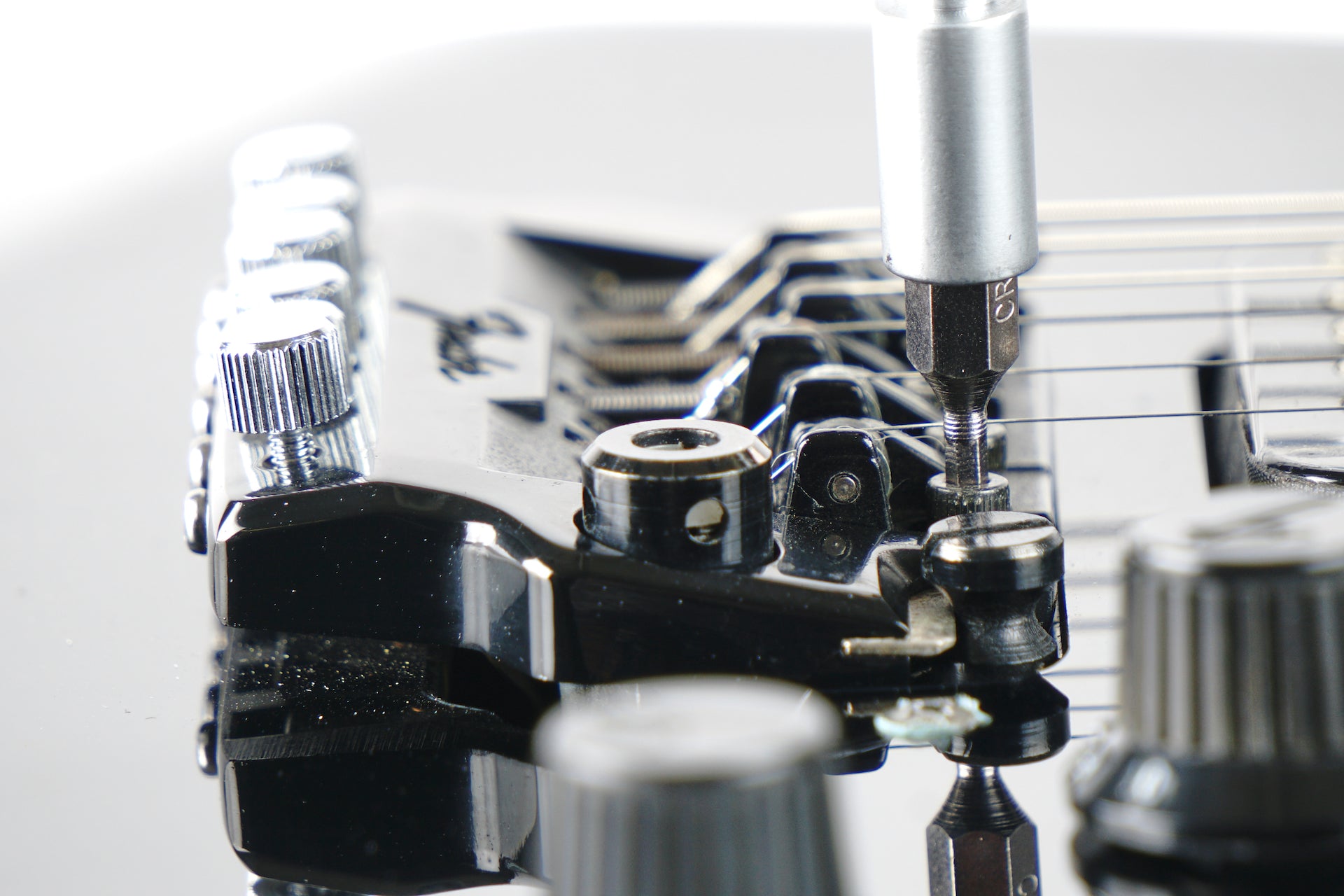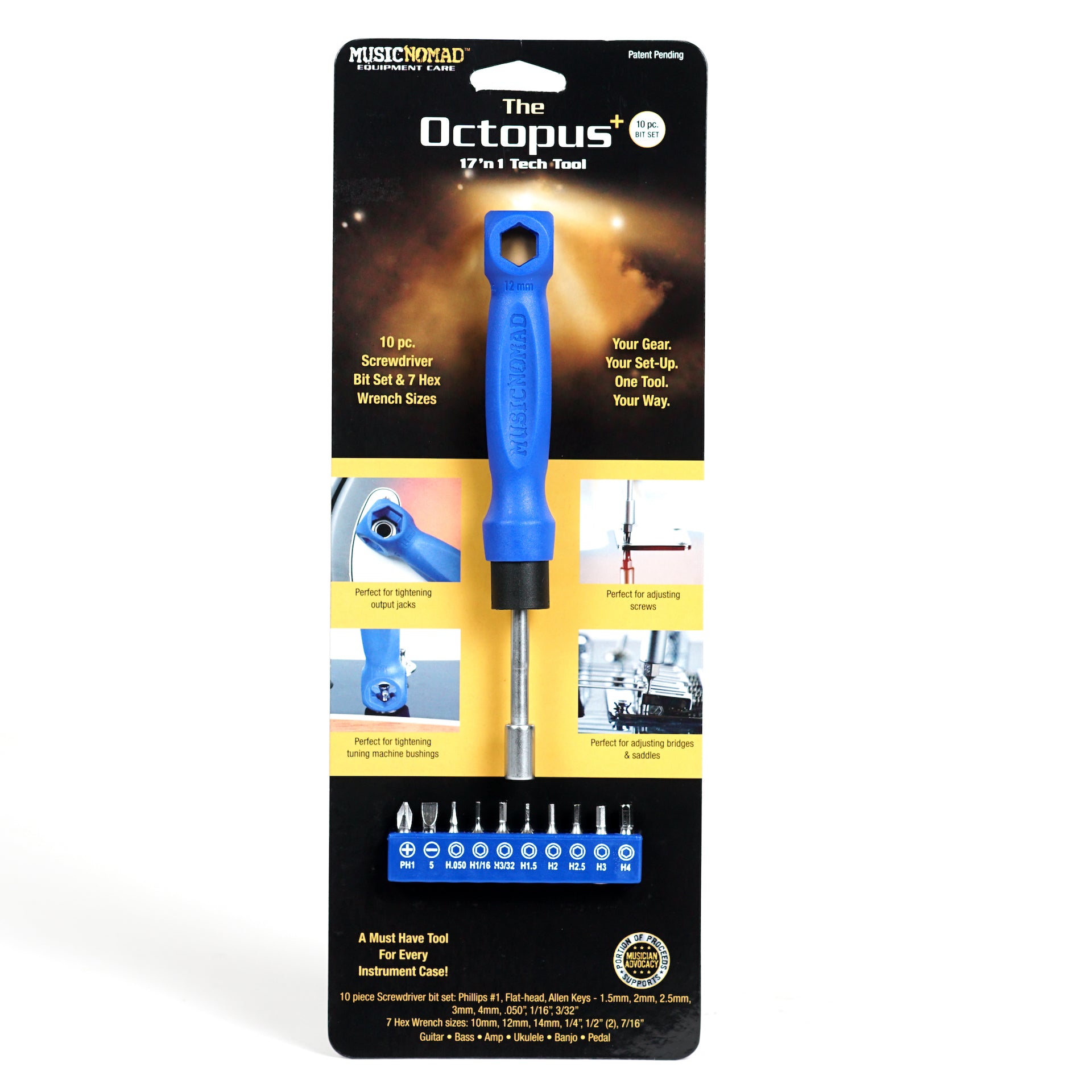 Forget lugging around screwdrivers, nut drivers, wrenches and Allen Keys or multiple bit sets in bulky cases, The Octopus 17 ‘n 1 Tech Tool can handle every job! Music Nomad’s patent pending, innovative design is the perfect tool for tightening or loosening screws and hex nuts on vital gear components like bridges, saddles, locking nuts, output jacks, control pots, tuning machine bushings and more. Just say no to metal....tools that is! Our ergonomic handle is made from strong ballistic nylon material that won’t scratch or ding your hardware and is engineered for the most popular Hex Wrench sizes : 10mm, 12mm, 14mm, 1/2” (2) & 7/16”. Our unique handle also holds the universal adapter giving you even more versatility. The metal universal adapter features a 7th 1/4” Hex Wrench for tightening or loosening hex nuts, in addition it securely holds our 10pc screwdriver bit set. Our screwdriver bit set features Phillips & flat head bits along with 8 Allen Key bits (.050", 1/16", 3/32", 1.5mm, 2.0mm, 2.5mm ,3.0mm, 4.0mm) for nearly any kind of screw you may find on your gear. It tackles every job including precision adjustments to pieces like tremolo systems. Take out the universal adapter to utilize our 1/2” narrow profile Hex Wrench for tightening tough to reach sunken pots & tele cups. This little tool delivers big results and is a must have for every instrument case.