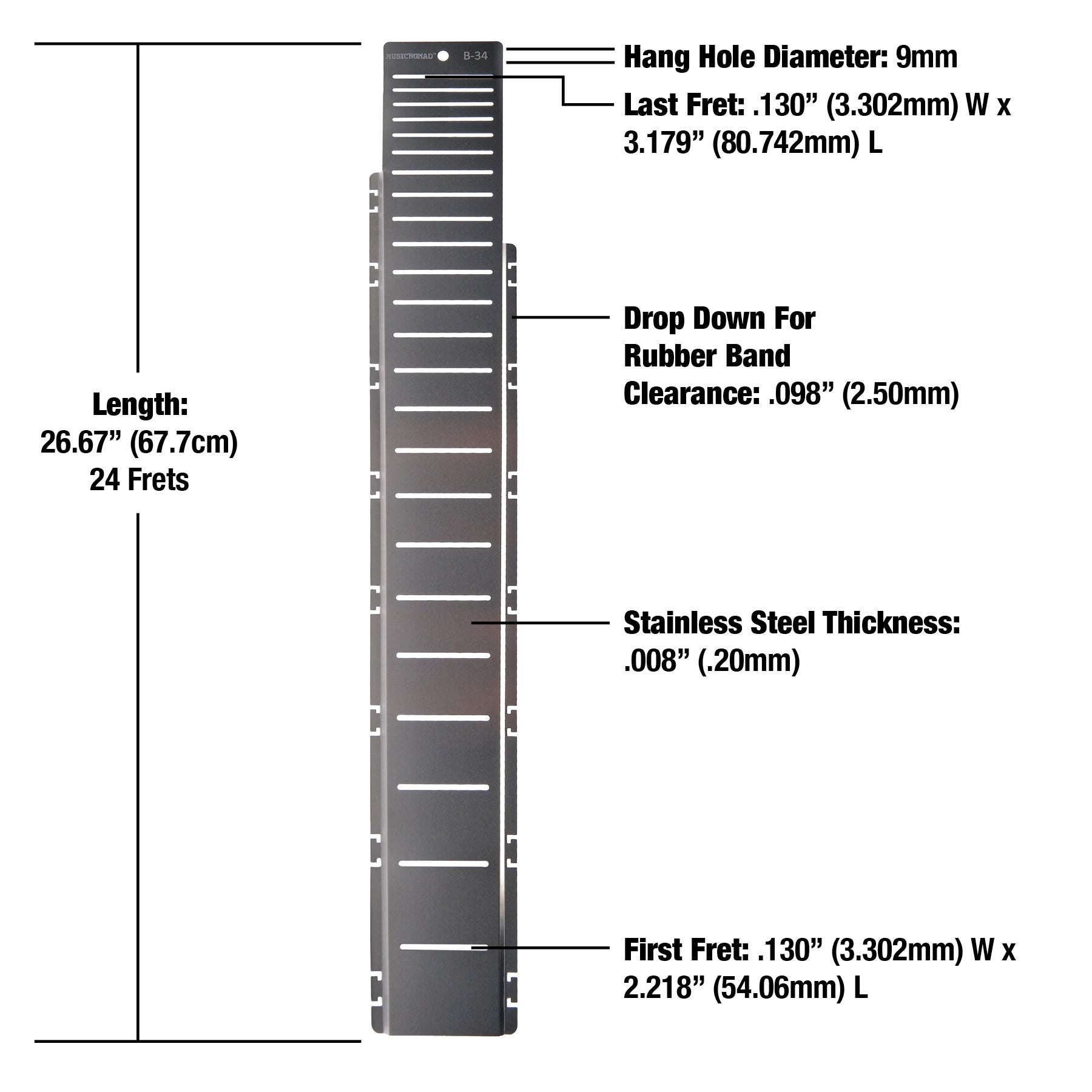 Our high quality stainless steel is the perfect thickness at .008" (.20mm). We use a precision manufacturing process free of burrs and leaves all edges smooth and rounded, so it protects the fretboard without damaging it. The tapered design has slot sizes that measure from the first fret .130” (3.302mm) W x 2.218" (54.06mm) L to the last fret .130” (3.302mm) W x 3.179” (80.742mm) L and fits all fret sizes (from narrow to jumbo) found on 4 and 5 string bass guitars with up to 24 frets.