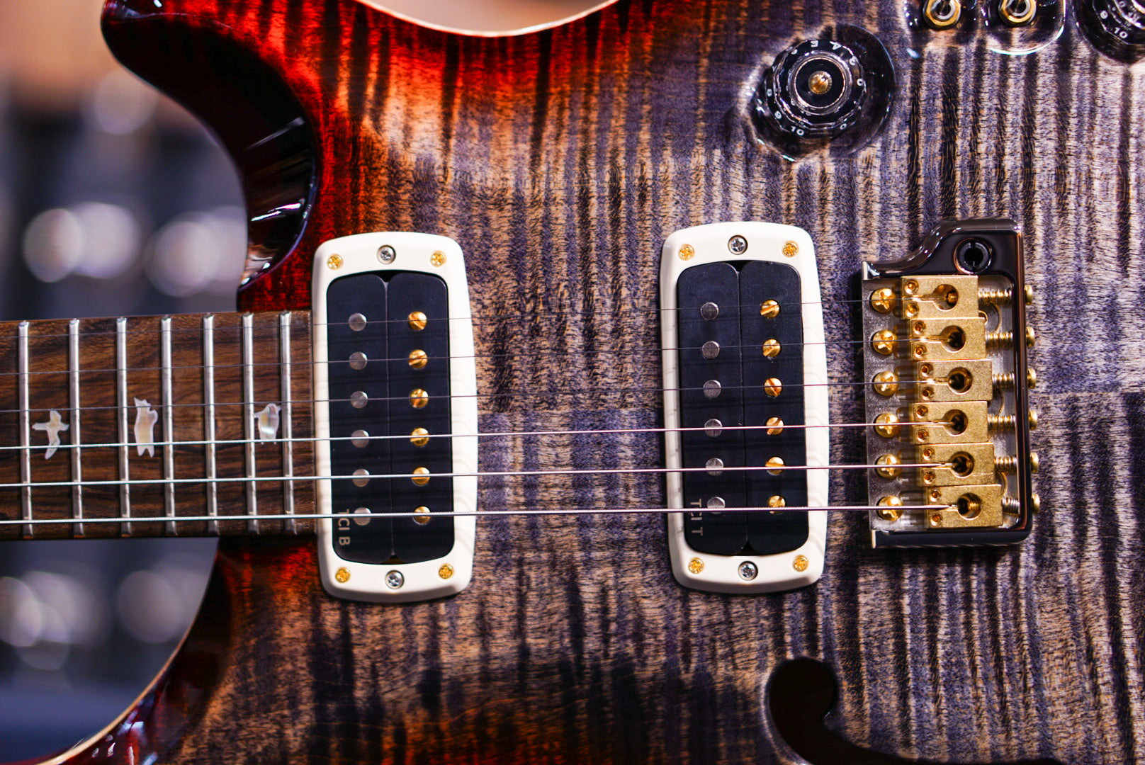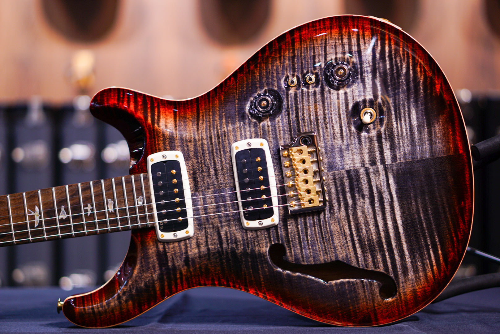 The 40th Anniversary Custom 24-08 Semi-Hollow Limited Edition starts with a “10-top” grade figured maple top, mahogany back and neck, and a ziricote fretboard. This wood combination, along with our thorough wood drying processes, creates a stable and resonant foundation. The addition of semi-hollow construction adds an even fuller organic quality to the tone, while the f-hole also adds an elegant visual touch.