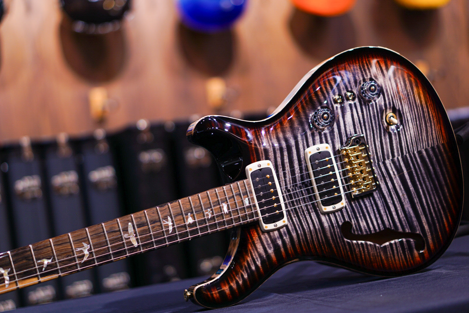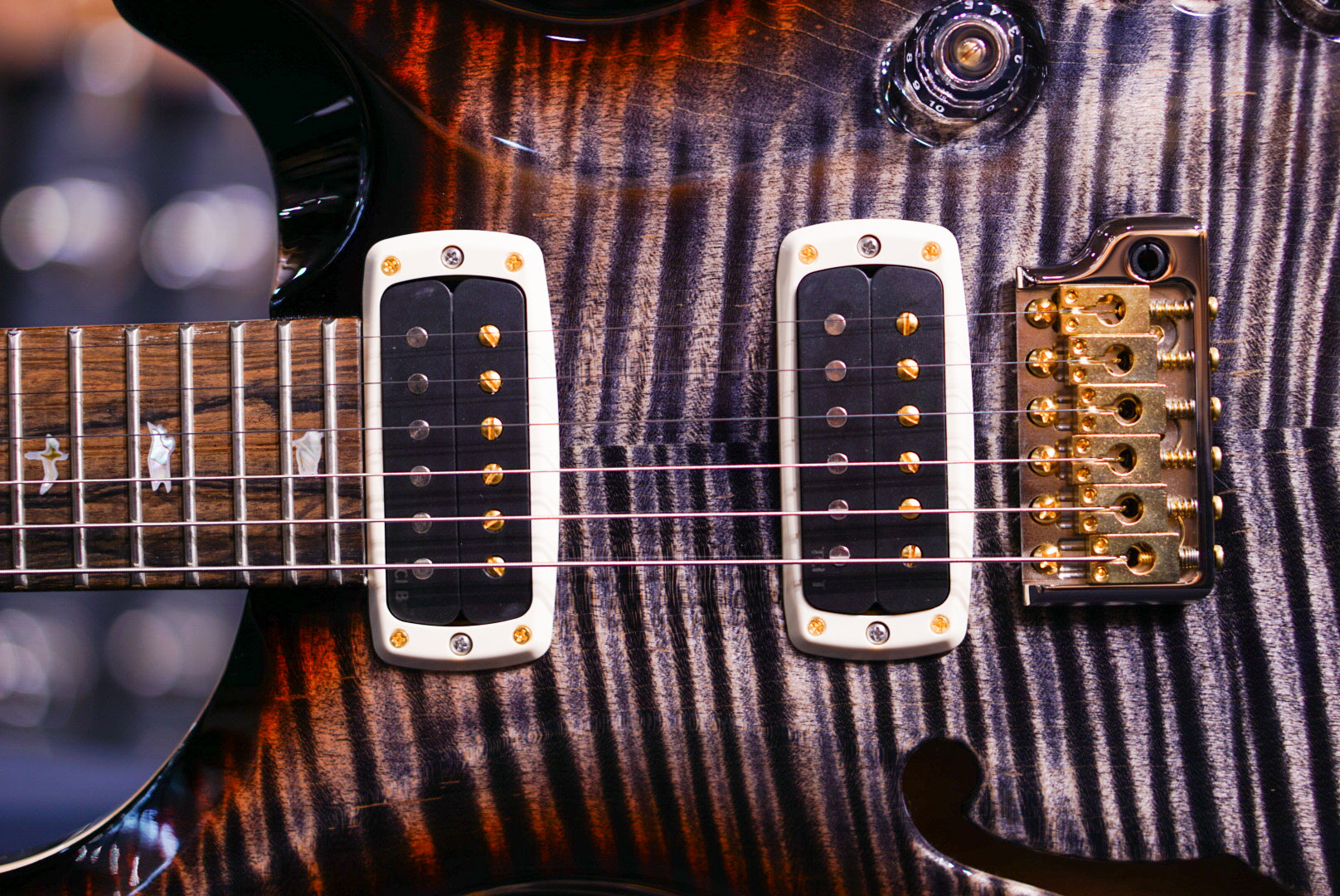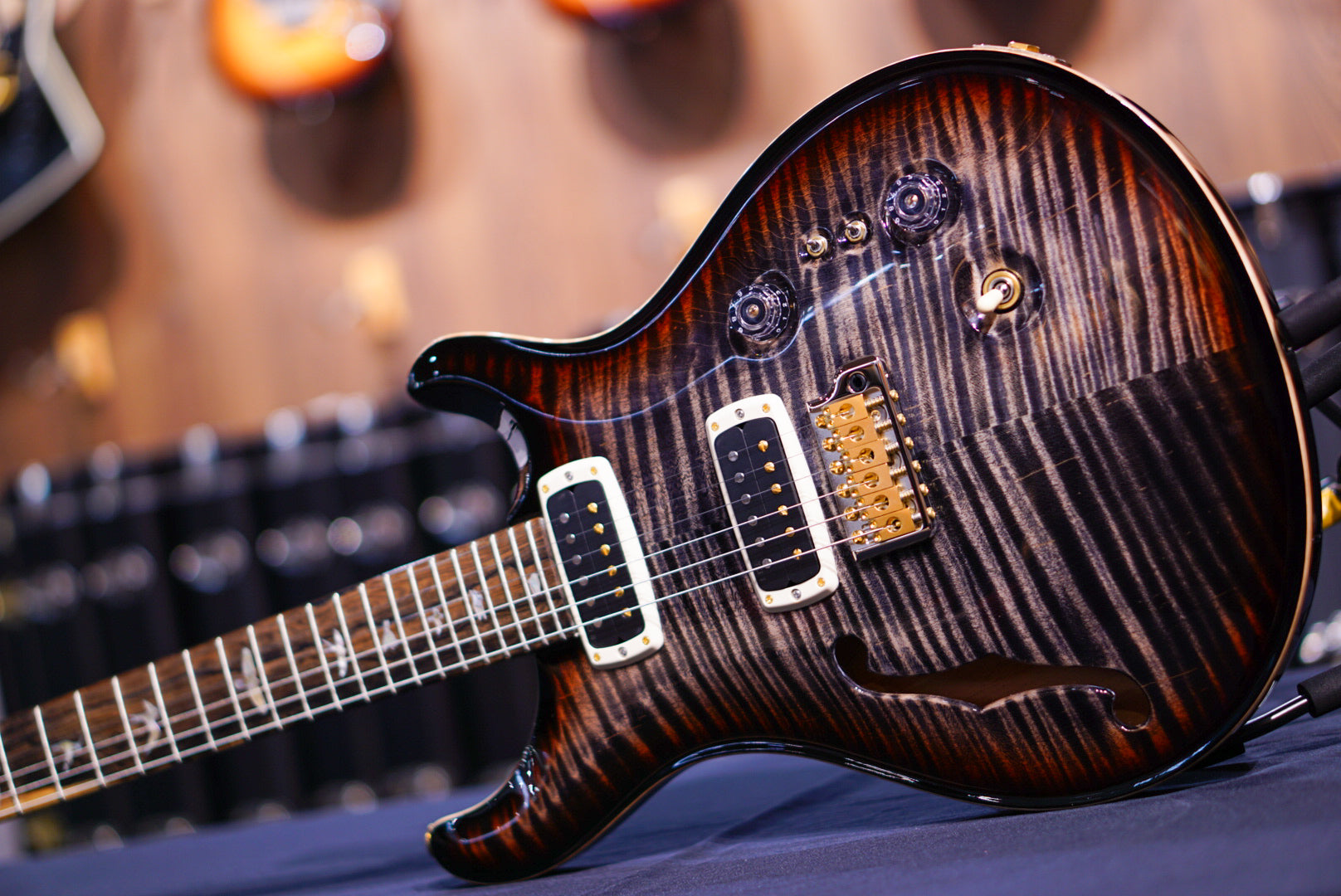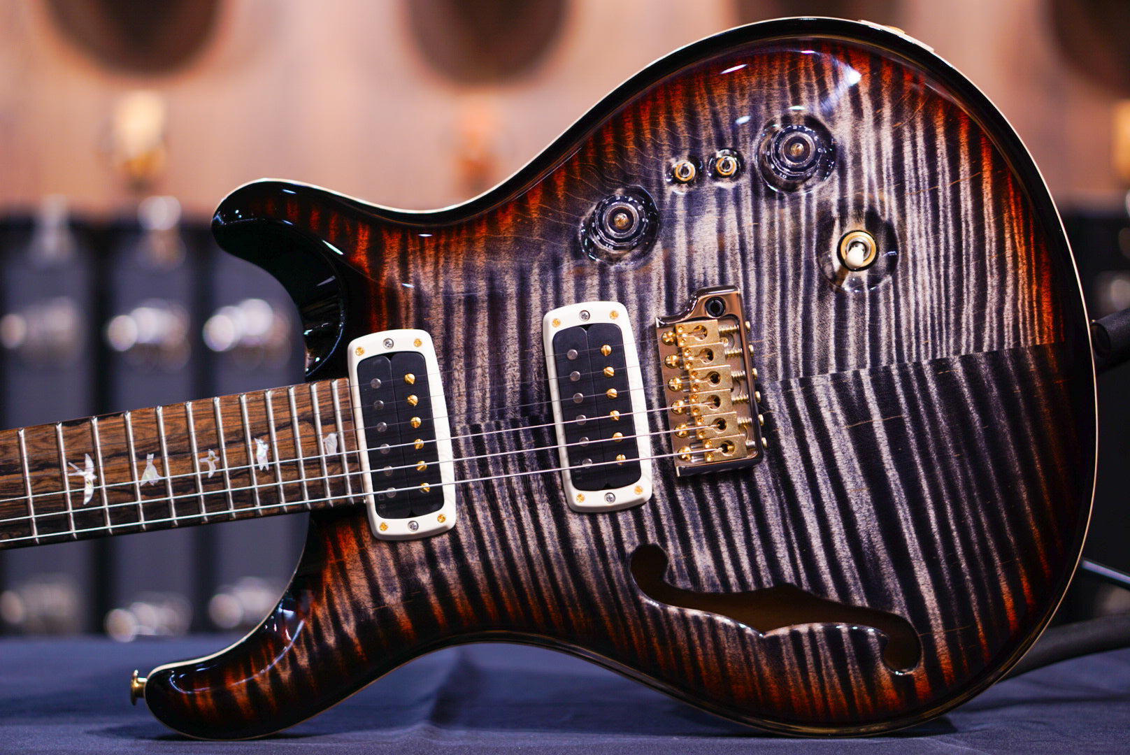 The 40th Anniversary Custom 24-08 Semi-Hollow Limited Edition starts with a “10-top” grade figured maple top, mahogany back and neck, and a ziricote fretboard. This wood combination, along with our thorough wood drying processes, creates a stable and resonant foundation. The addition of semi-hollow construction adds an even fuller organic quality to the tone, while the f-hole also adds an elegant visual touch.