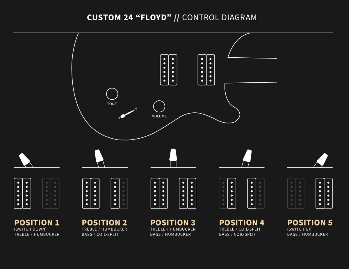 The Custom 24 "Floyd" is equipped with the time-tested Floyd Rose "Original" tremolo system and PRS's \ m / (metal) pickups. The Floyd Rose "Original" tremolo and locking nut tuning system is a double-locking design precision-made from high quality steel. This design combination allows players to lock the string at the nut and at the bridge to keep the guitar in tune even during the heaviest dive-bombing sessions.