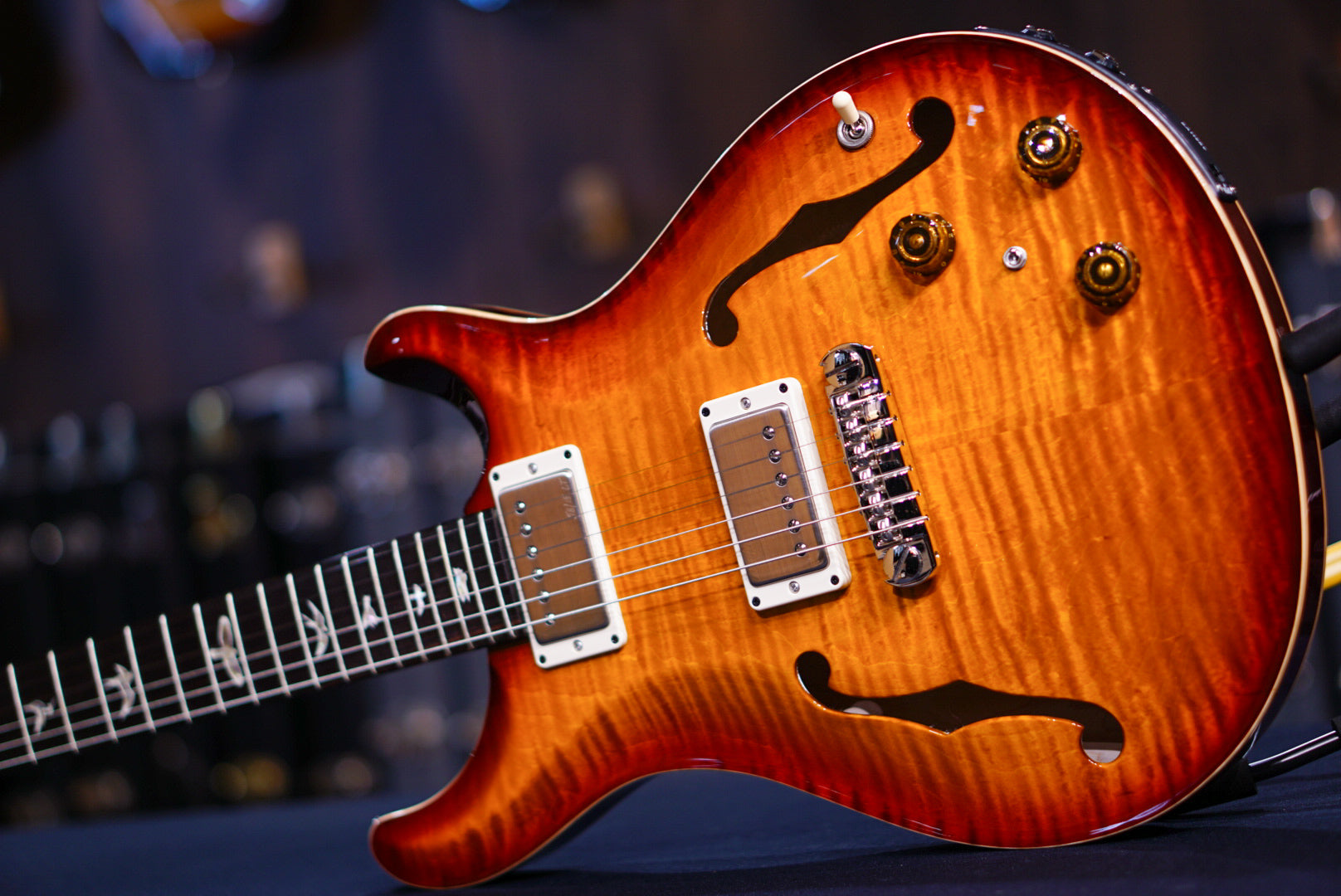 The LR Baggs/PRS Piezo System comes standard, providing musicians with the versatility of wielding both acoustic and electric guitar tones in one instrument. There are two output jacks on the Hollowbody II Piezo, allowing guitarists to plug into their favorite electric guitar or acoustic guitar amp or DI into a soundboard. By utilizing the separate blend control, the tone of the Hollowbody II Piezo's 58/15 LT pickups can also be combined with acoustic sounds through a single output.