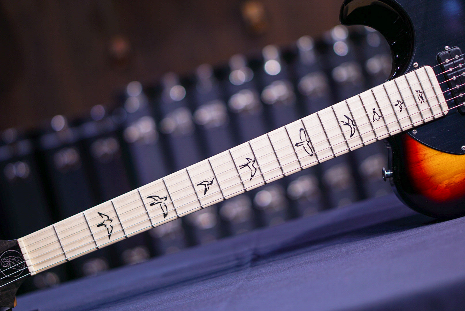 Other features include a PRS plate-style steel bridge, vintage-style locking tuners, bone nut, and Kennedy’s “Geometric Owl” logo from his “Ides of March” solo release, representing wisdom and adaptability.