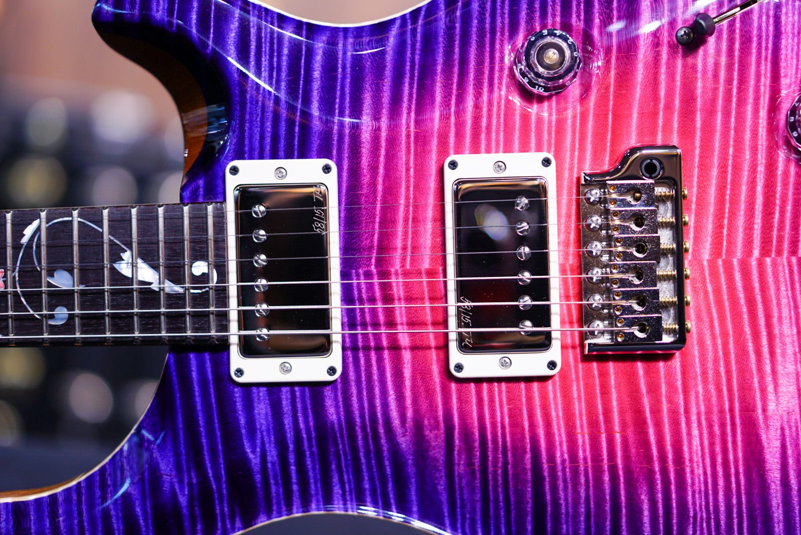 The electronics feature a volume and tone control with 5-way blade pickup switch, func- tioning the same way as a PRS Custom 24. The Private Stock Orianthi Limited Edition is outfitted with 58/15 treble and bass pickups, which offer a round tone.