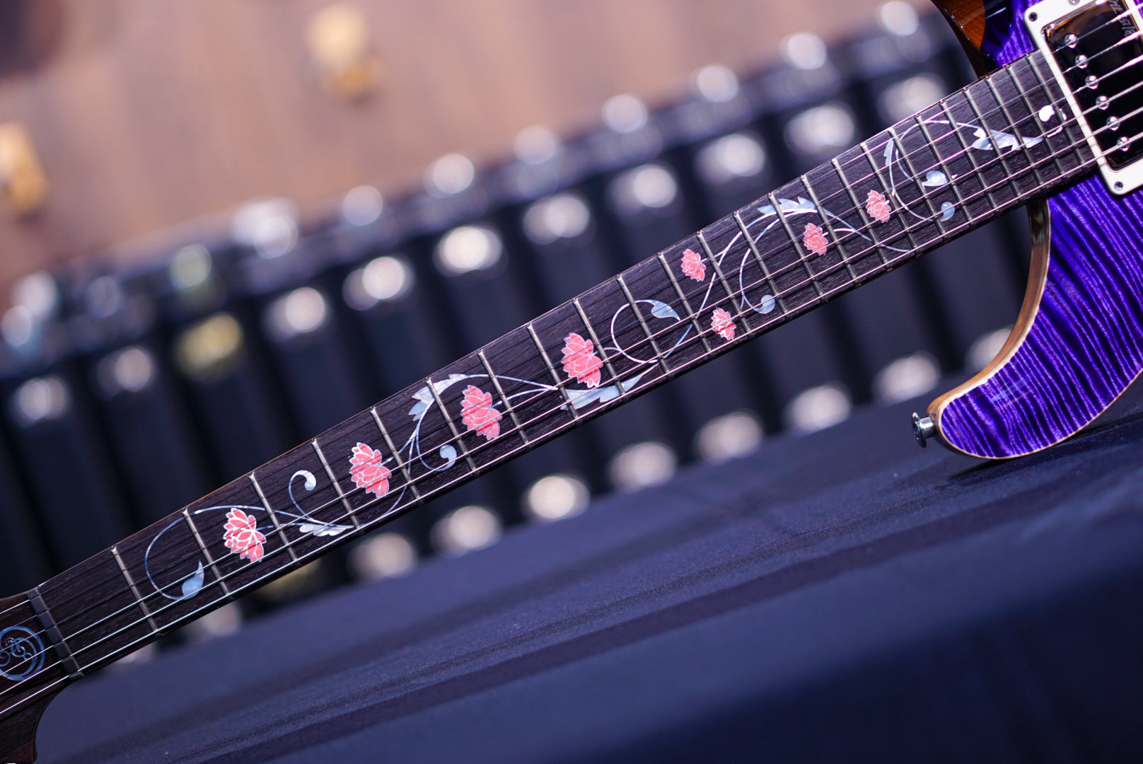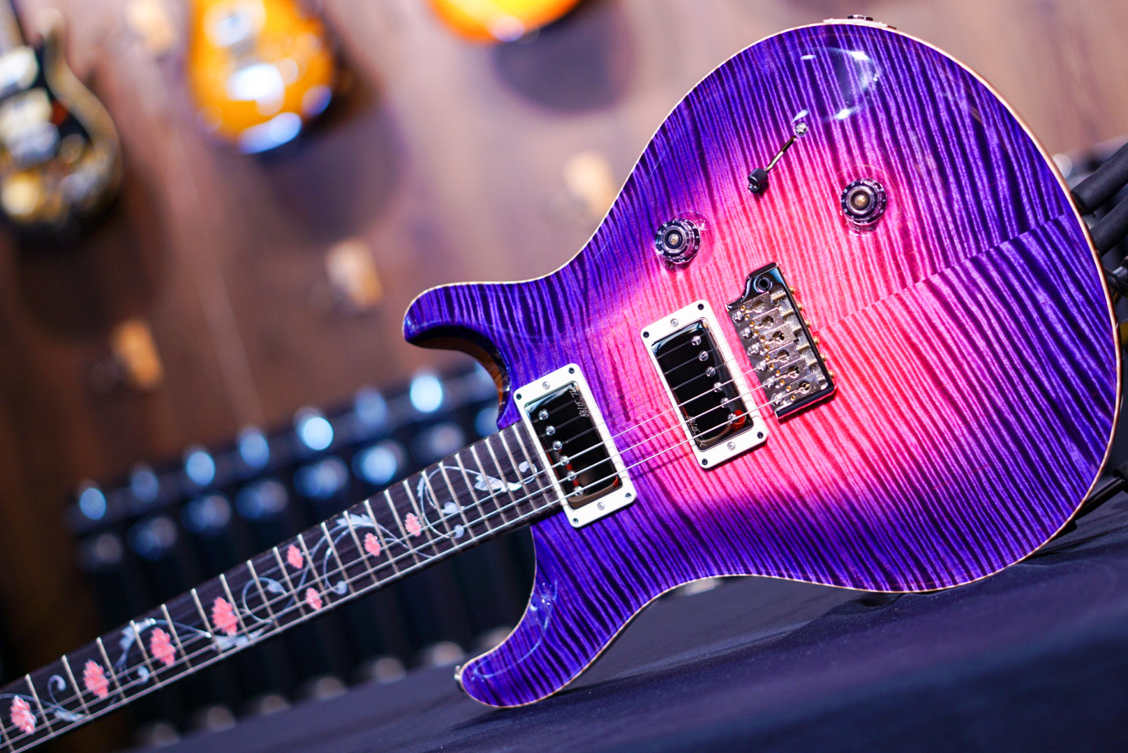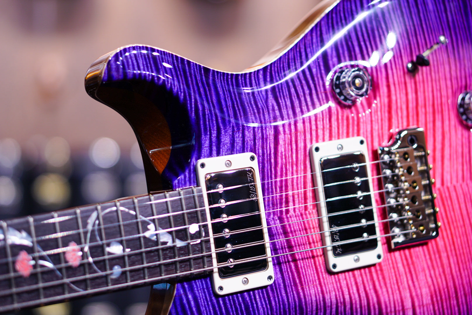 The Private Stock Orianthi Limited Edition keeps many of the specs as that original artist build, including a figured maple top, mahogany back, and a 24-fret, 25” scale length, Pattern Thin mahogany neck with rosewood fretboard. Like the original, the fretboard is adorned with a custom “Lotus Vine” inlay (similar to PRS’s classic “Tree of Life” design) that was inspired by a pen Orianthi sent to the team. The inlay is made from Asian Pink Coral and mother of pearl. Newly developed to showcase the Private Stock grade figured maple, the Private Stock Orianthi Limited Edition comes in Blooming Lotus Glow, which has a pink center glow that fades outward to a similar purple as the original artist build, which was opaque rather than hand stained.