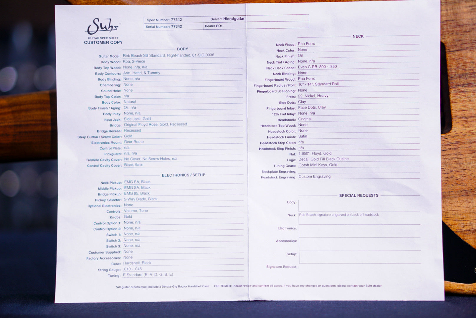 Reb Beach has been a part of the Suhr family since he bought his first guitar built by John Suhr in 1986. We are now proud to present the Reb Beach Suhr Standard Signature Model, based on Reb’s ‘number one’ guitar. This signature marriage of a solid Koa body with a Pau Ferro neck and fingerboard is truly a unique and beautiful combination, in aesthetics and tone.